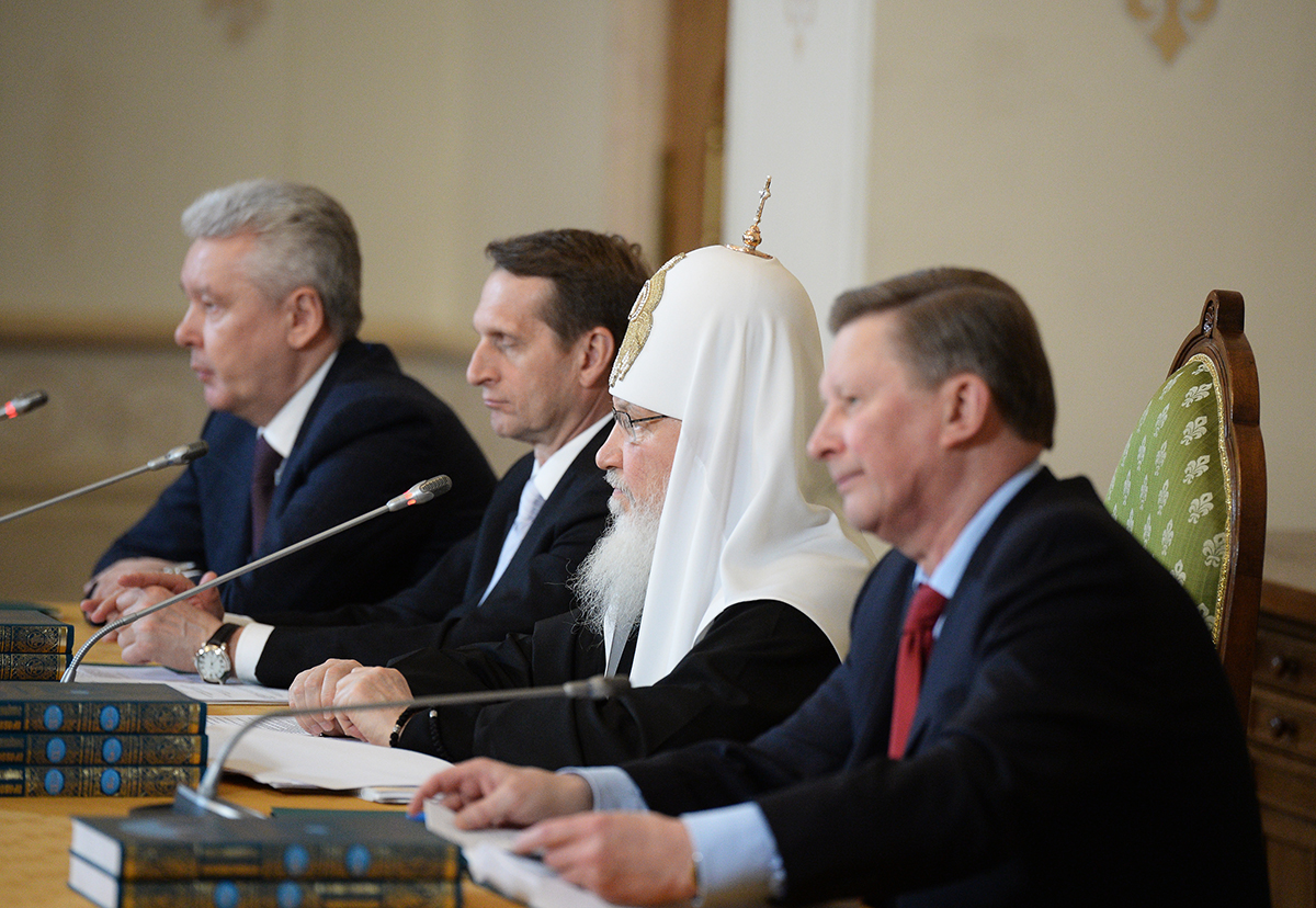 Kremlin chief of staff Sergei Ivanov, far right, next to Patriarch Kirill of Moscow and all Rus’ of the Russian Orthodox Church; next is Sergei Naryshkin, chairman of the State Duma, and Sergei Sobyanin, mayor of Moscow, at the board meeting of the Russian Orthodox Encyclopedia on March 11, 2015. Photo by patriarchia.ru