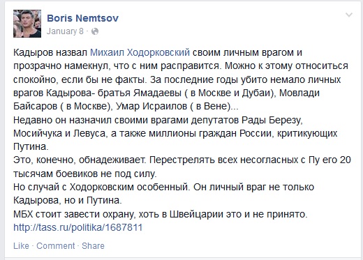 Nemtsov commented on Kadyrov’s statement advising Khodorkovsky to get a body guard, “although this is not customary in Switzerland,” and that in recent years “quite a few personal enemies of Kadyrov have been killed” and listed them.