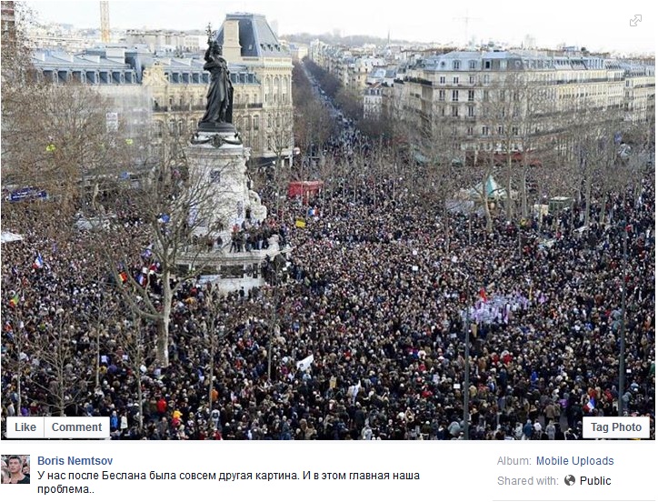 In this post on January 11, he posted a picture of another solidarity demonstration in Paris, and contrasting Paris with how Moscow dealt with responses to terrorist attacks, he said, “We had a completely different picture in our country after Beslan. And that’s our main problem…”