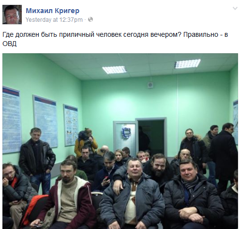 Mikhail Kriger, center, on December 30, 2014. Translation: Where should a decent person be this evening? Correct. At the police precinct.