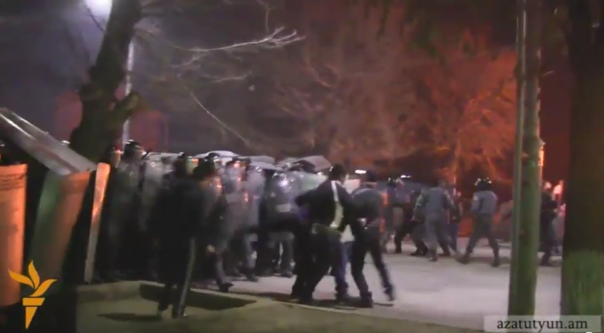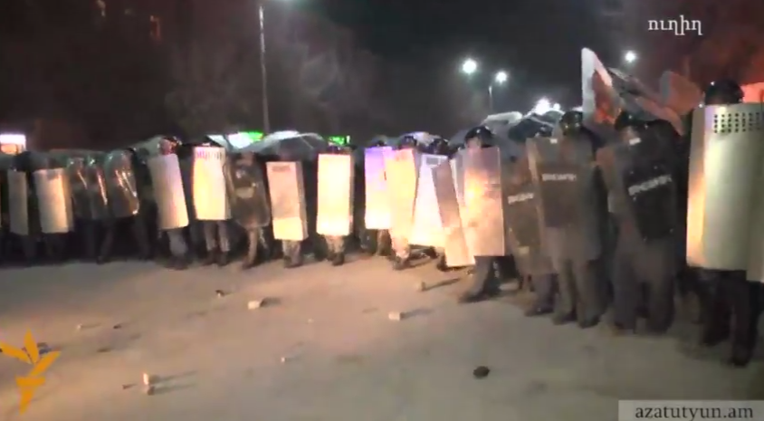 The protesters responded with a hail of stones thrown at several rows of riot police. An Armenian opposition parliamentarian, Zaruhi Postanjian, begged them to back away and avoid further violence.