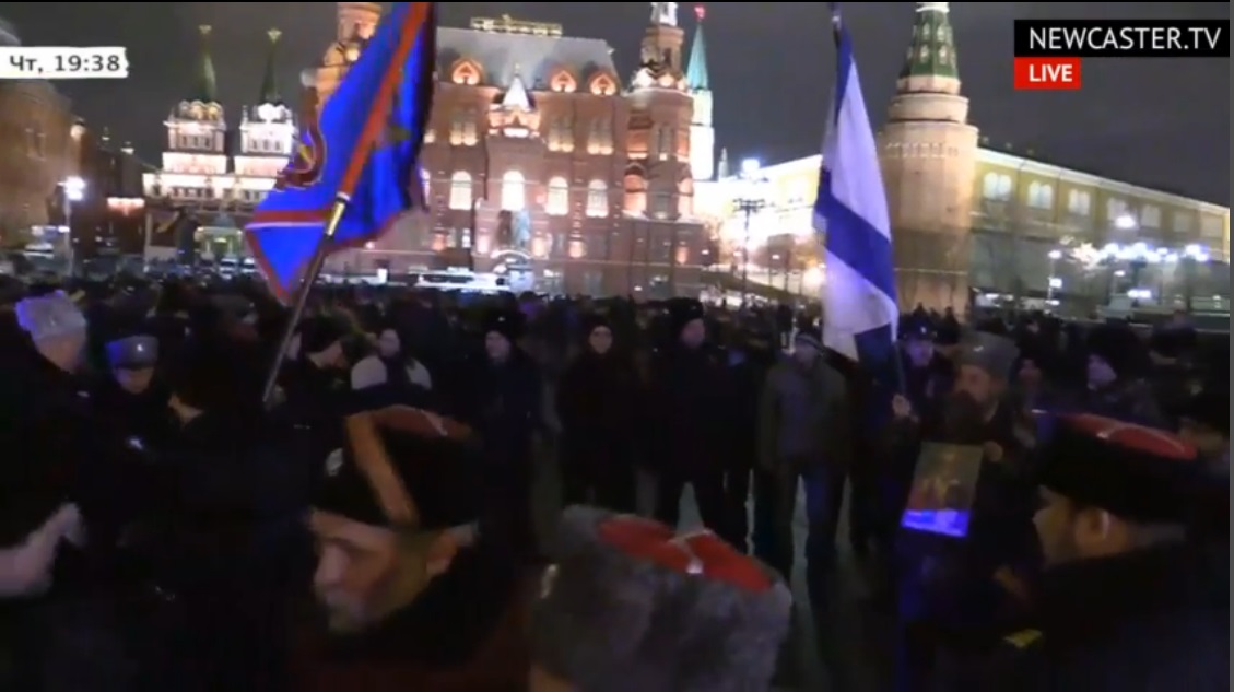 Cossacks showed up at the Navalny demonstration in December, shouting slogans in support of the “Donetsk People’s Republic” where they have joined other Russian-backed fighters. It’s not clear whether this group were part of the anti-opposition hecklers or whether authorities planned to use them in suppressing the demonstration in some way, as Cossacks are paid by the Russian government to assist in police functions.