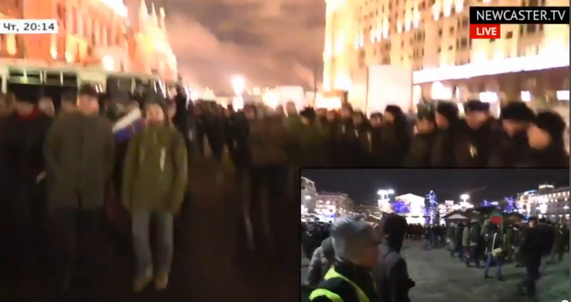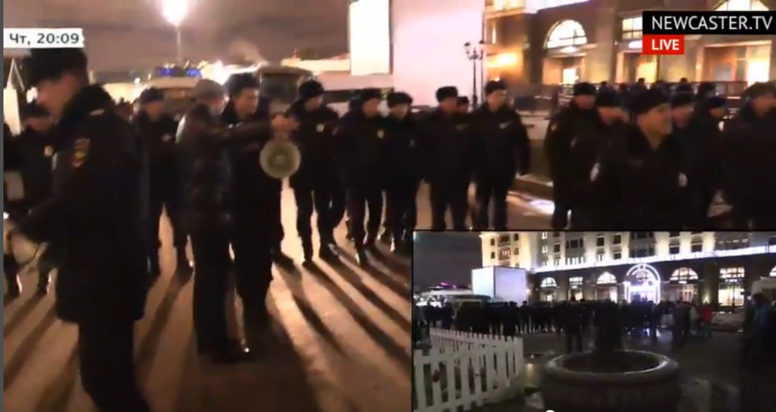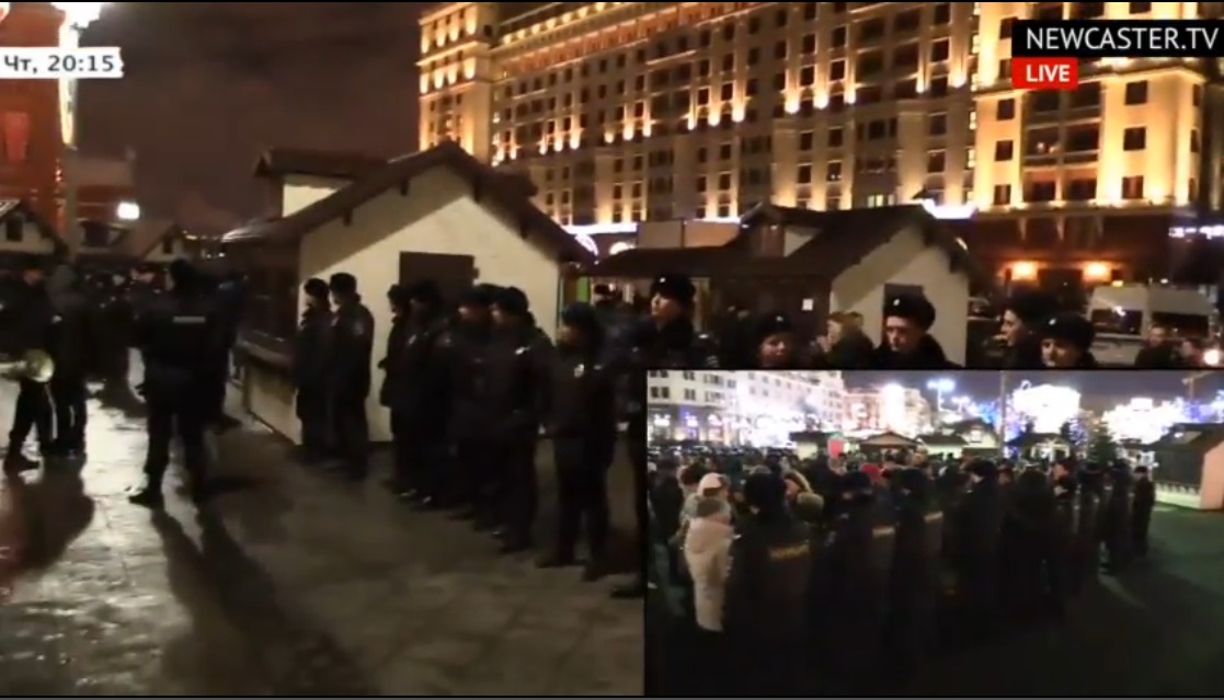 Moscow police have formed lines and are methodically moving south and east across Manezhnaya Square now, pushing demonstrators toward the other side.