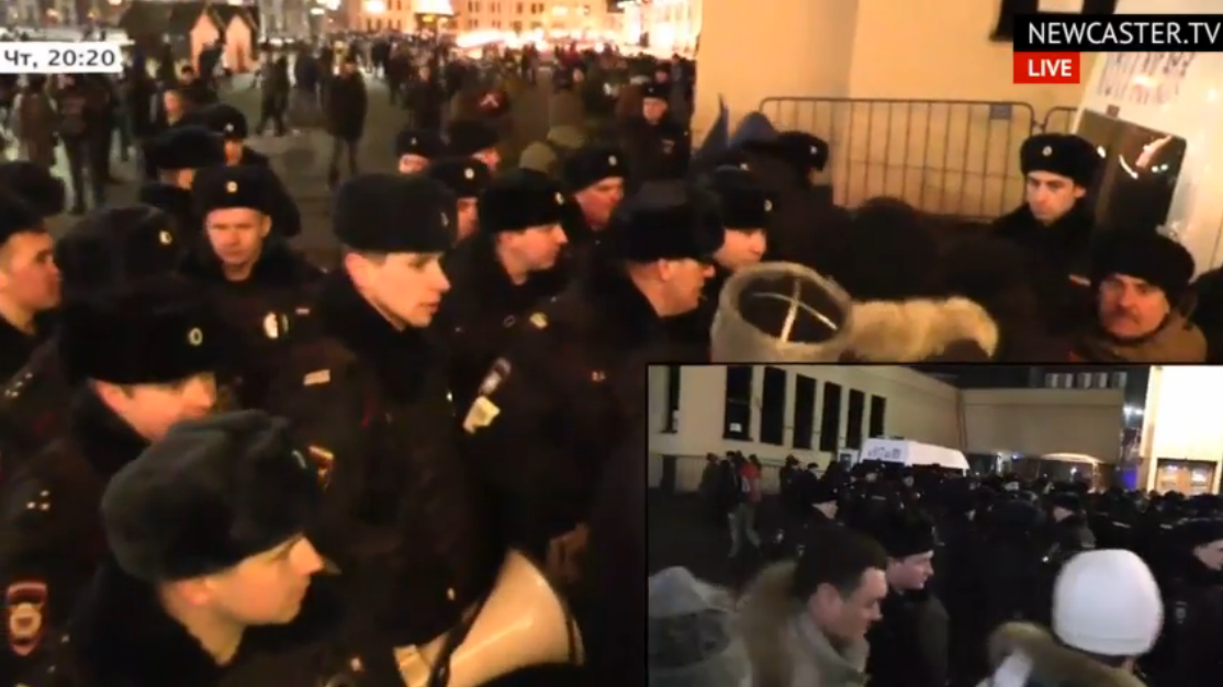 Moscow policed lined up in rows and pushed demonstrators off Manezhnaya Square, forcing them down into the Revolution Square metro station or away from Manezhnaya Square.