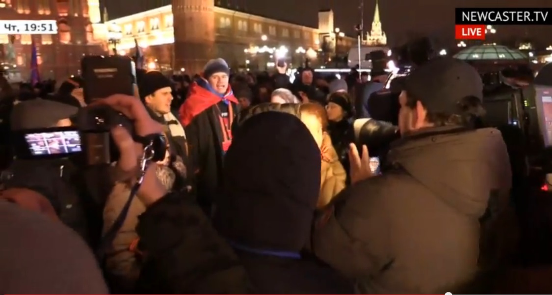 The narrator for the live feed from Manezhnaya Square in Moscow tonight says most of the people who have arrived on the square seem to be anti-Maidan protesters heckling the opposition, not supporters of opposition leader Alexey Navalny.
