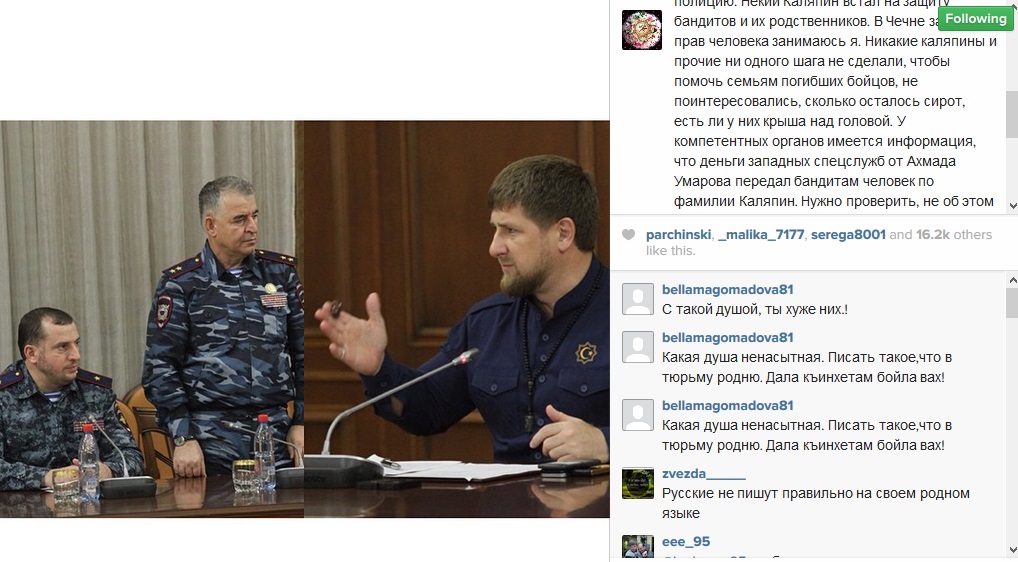 Earlier I announced that relatives should be responsible for the criminal actions of their sons, if they did not stop them themselves and did not call the police. A certain Kalyapin came to the defense of the bandits and their relatives. In Chechnya, the Kalyapins and others have not taken one step to help the families of the soldiers killed, they don’t take an interest in whether they left orphans, whether they have a roof over their heads. The competent organs have information that the money of Western intelligence services from Akhmad Umarov was transferred to the bandits by a man with the last name of Kalyapin. We should check whether this is the same Kalyapin.