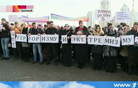 Yesterday in Grozny, 50,000 people turned out to the state-sponsored demonstration against terrorism, where speakers made calls to expel human rights defenders from Chechnya, TASS reported. Russia’s TV1 broadcast the rally and TASS published a screenshot with the sign against Kalyapin.