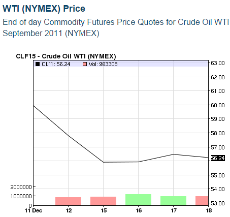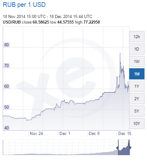 One month ago the ruble was trading at about 46.85 to the dollar, and people were already talking about the currency’s devaluation. Over the last two days the currency has “stabilized” at about 60-60.70 per dollar. I put that word in quotes because as you can see from the chart below there has been significant volatility over the last two days: