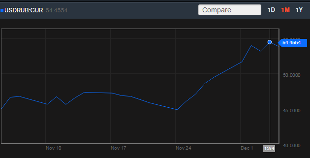 The rubles has improved slightly today. According to Bloomberg, the currency has traded between 52.84 rubles to a US dollar and 54.33 rubles to the USD, but right now it is trading at 52.93, a gain of 2.80%.