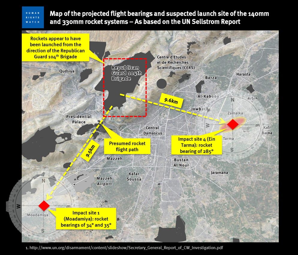 Or did it? Though the UN report did not state who was responsible for launching the attack, it included detailed ballistic evidence, including the trajectory of the weapons based on where they impacted. Human Rights Watch then took that trajectory information and did what the UN was unwilling to do – place it on a map. The result? The area where the rockets came from is not only controlled by the regime, it is one of Assad’s key bases, a Republican Guard base with strong ties to both artillery and rocket launches, and to chemical weapons: