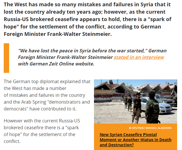 Sputnik, a Russian state-owned, English-language news agency, ran a story today claiming that the German foreign minister, Frank-Walter Steinmeier, had, in part, blamed protesters and pro-democracy activists for the Syrian civil war.