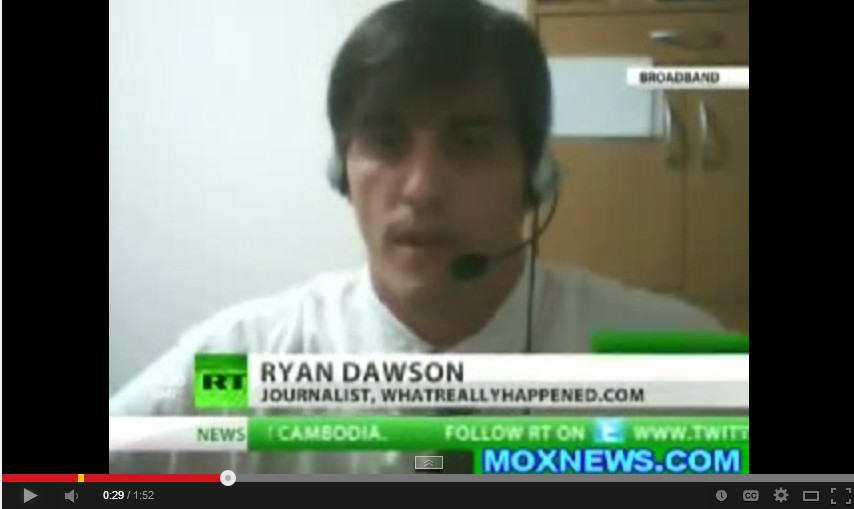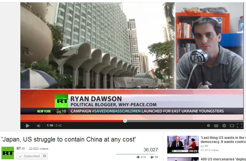RT identified him as a journalist for an interview about the US role in Yemen in which he baselessly asserted that the US has an interest in exacerbating the conflict in Yemen (video here). They identified him as a political blogger and author for an interview about how western media overstates Russia’s role in the Ukraine crisis “because Russia is a threat to the US’s hegemony” (video here). Dawson’s mispronunciation of “hegemony” makes this one especially absurd). He was “a peace campaigner and human rights activist” for an October, 2012 interview (video here). They identified him as an author and “analyst” to get his views about territorial disputes between China and Japan (video here). Dawson was a “journalist specializing in Asian affairs” when RT sought his opinions about North Korean threats against South Korea (video here). He was identified by RT as their “geopolitical analyst” when they sought his expertise about human rights abuses at Guantanamo (video here). On May 31, 2014, Dawson was a “political blogger and peace activist” when he told RT viewers that Japan was drumming up regional territorial conflicts involving China in order to boost their arms industry (video here). When they sought Dawson’s views on US raids on terrorist in Somalia (Dawson says the raids were motivated by Pres. Obama’s domestic political concerns), RT accurately described him as a writer for the website WhatReallyHappened.com, but they failed to identify that as a bigoted conspiracy theory website (video here).