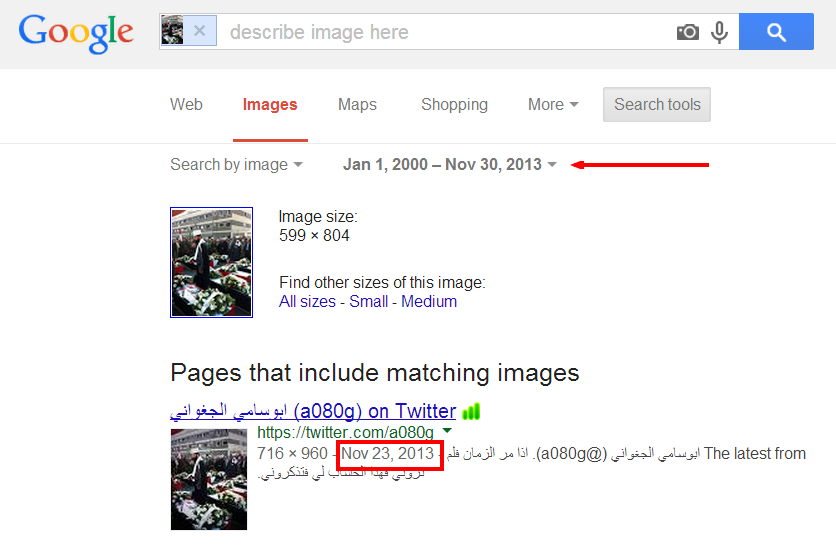 But the article did contain one piece of verifiable evidence — an embedded tweet that showed a picture of the caskets of some of the dead. Pictures are some of the easiest pieces of evidence to verify, especially since a “reverse image search” using Google or Tineye.com can see if the picture has been posted elsewhere on the internet.