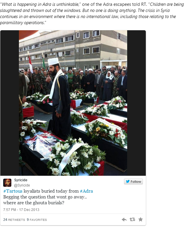 Weeks later there is still no evidence corroborating RT’s claims, despite the fact that the Syrian army appears to be retaking at least parts of the town from the rebels. By December 31st, the Syrian State media outlet, SANA, reports that thousands of civilians have been “evacuated” from the town. Not one of these civilians has posted a picture or video to social networks that proves that a massacre has taken place or that any group is responsible for crimes in Adra. On January 2nd, RT published an article carrying claims from the Syrian government that more than 100 people were executed by Islamists in the town. The article is currently unavailable for reasons unknown, but can be read here.