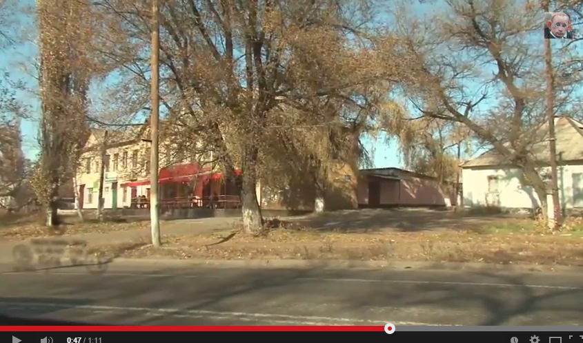 For additional confirmation, we can go up the road about a block east from the gas station toward Donetsk and find another pair of buildings, a restaurant with the red awning and the blue house in the video. These are in the third segment of the video.
