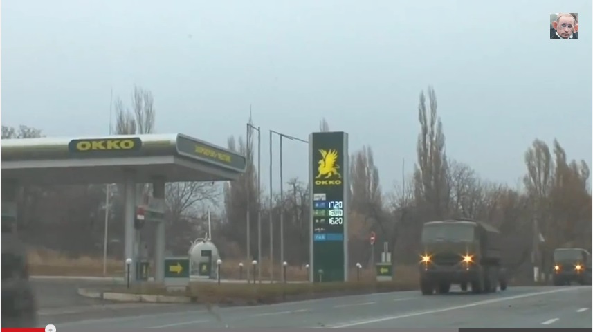 In the first segment, we see the military convoy moving past an OKKO gas station.