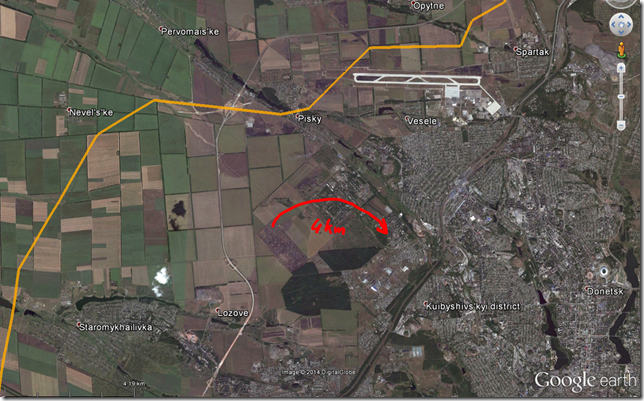 But who fired the shells? Some Ukrainian activists are maintaining that the Russian-backed separatists are advancing into the no-man’s land between rebel and Ukrainian forces and are firing back toward Donetsk. Some have even questioned whether the separatists could be targeting residential neighborhoods just to frame the Ukrainian government. One theory is that the damage done in videos above were from 120mm mortars which have a range of anywhere between about .5 and 7 km. One theory advanced by @djp3tros is that they were fired from a field 4km west of this street.