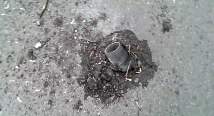 At 0:10 a resident points to a shell and a crater in the road, and the cameraman comes closer to it, focusing on the crater at 0:20. This is one of several such craters shown in the video.