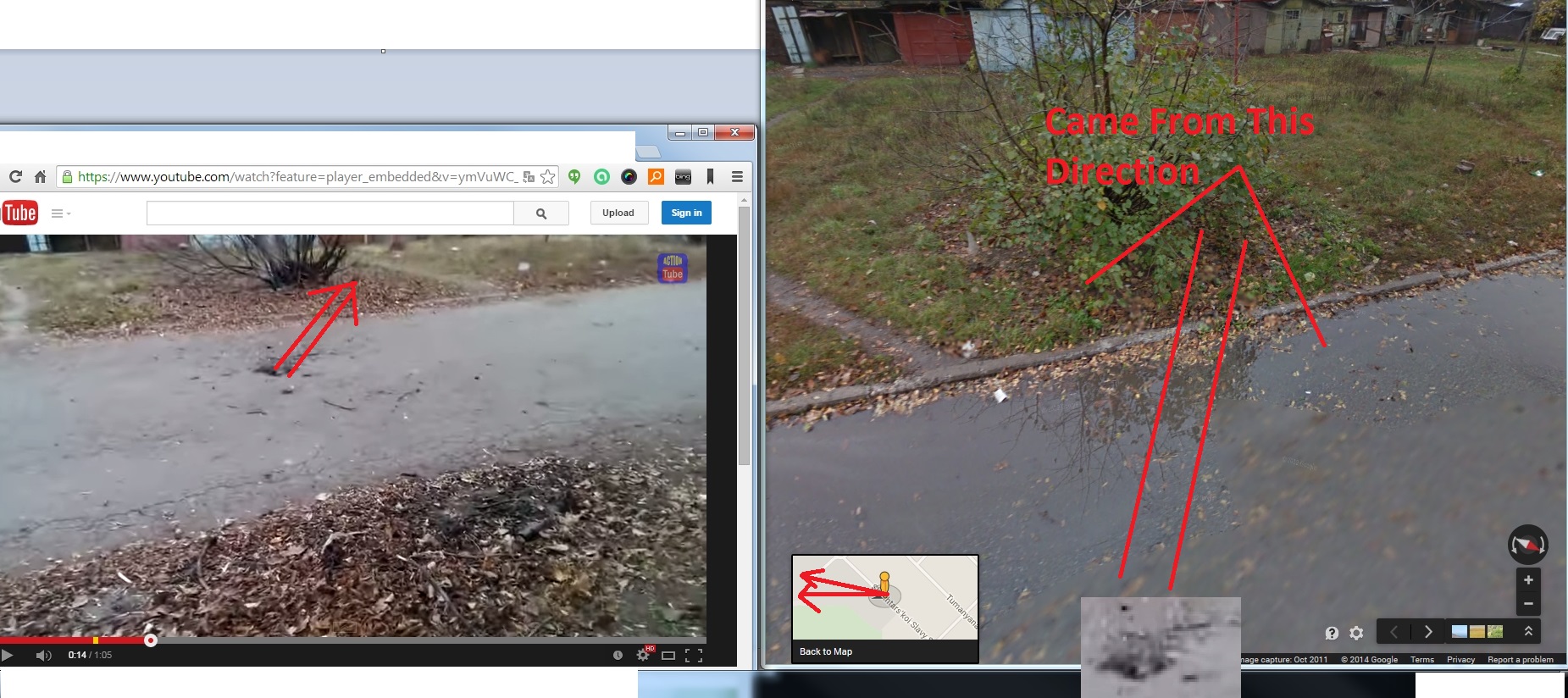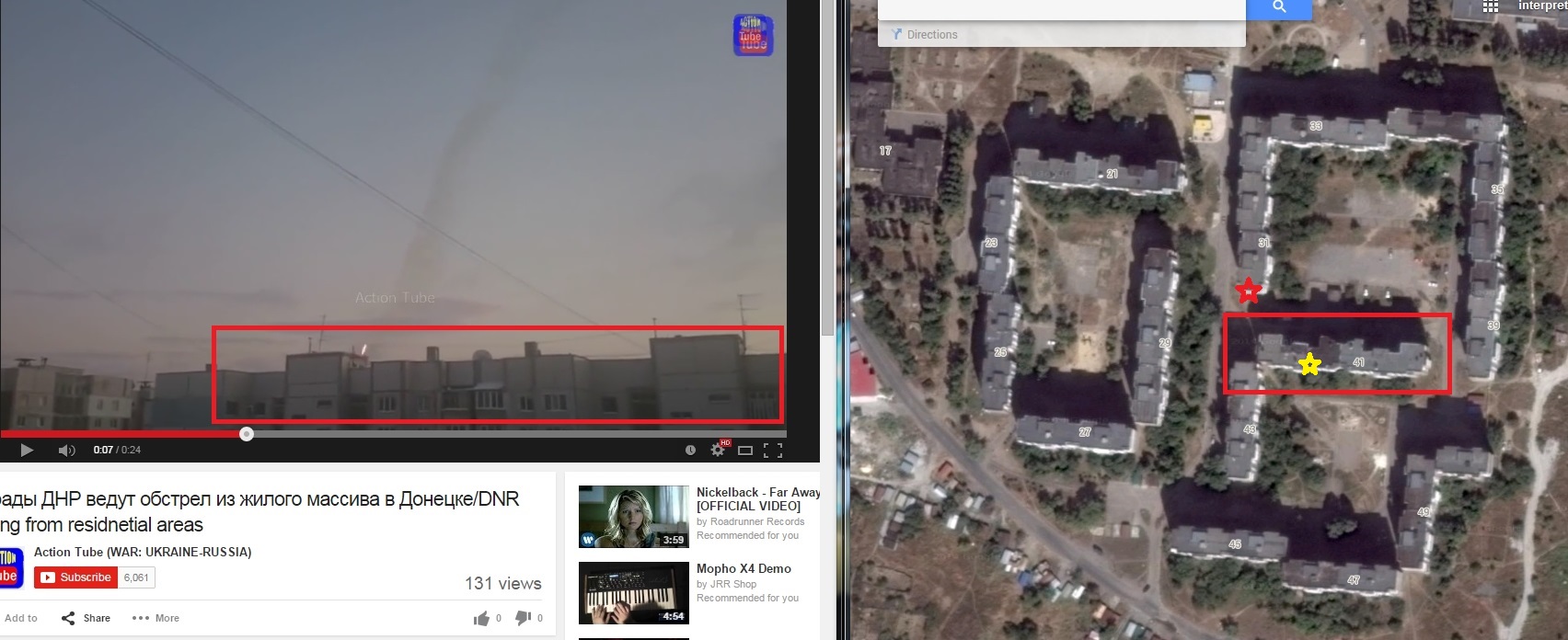 The description in this video says that it was taken in the same district as the others (Shirokiy) but from building 47, not 41. Sure enough, this matches precisely Google satellite images. Google street view shows that the Grad launcher is approximately positioned where the man selling something, possible kvass, in a happier time. Below we’ve put the map next to a screenshot from the video, with a few landmarks pointed out: