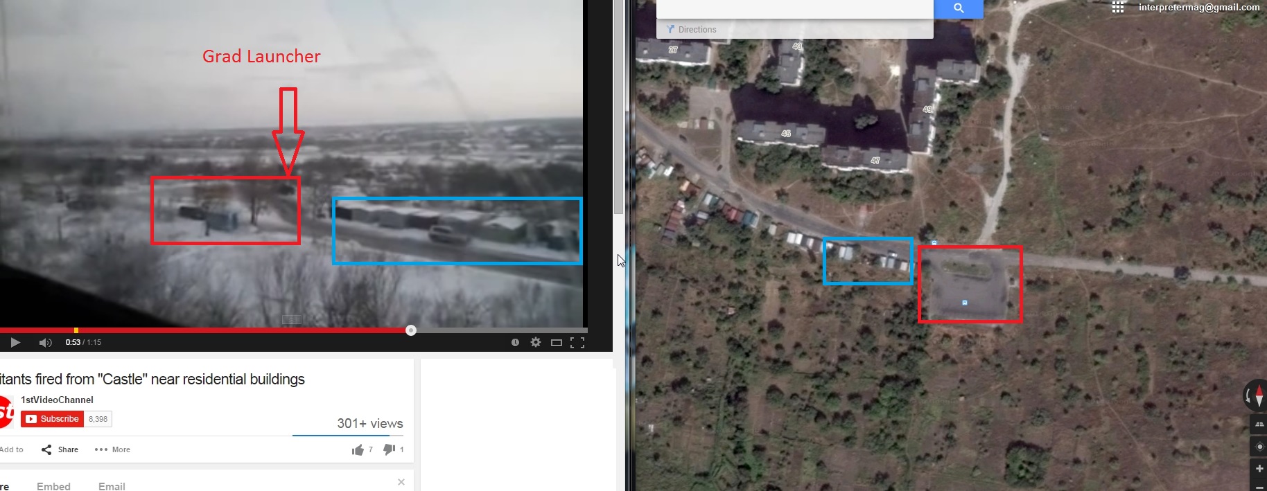 Earlier today we posted and analyzed a video which was geolocated to the Shirokiy area of Donetsk. The video shows Grad rockets being fired near a residential building. Children’s voices could be heard on the video. The launches were very close to residential buildings, and also matched previous videos of positions used by Russian-backed militants to fire artillery.