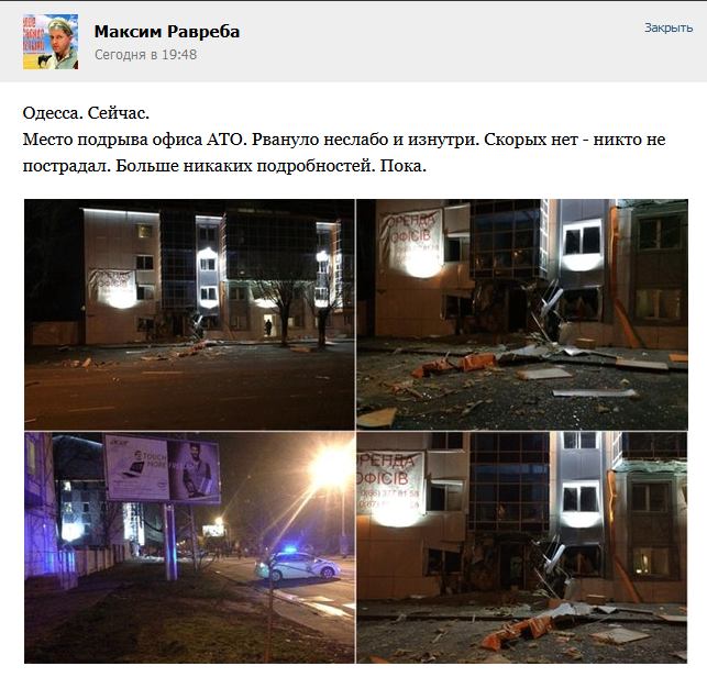 Translation: Odessa. Now. Place of explosion is ATO [Anti-Terrorist Operation office]. It burst out hard and from inside. There are no ambulances. No one was hurt. There is no more information – for now.