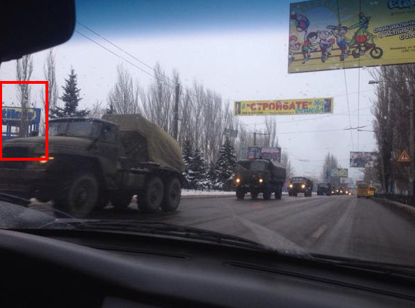 Translation: Makeyevka at 9:00. Convoy of armor, about 50 vehicles with the Russian flag. 08.12.2014.