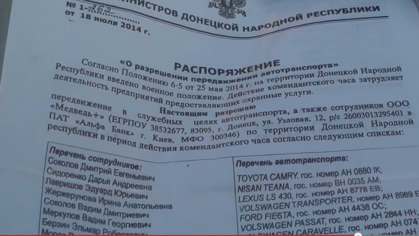 They also found papers signed by DPR Vice Premier Andrei Purgin granting a Donetsk security firm named Medved (Bear) permission to ride in vehicles outside of curfew hours.