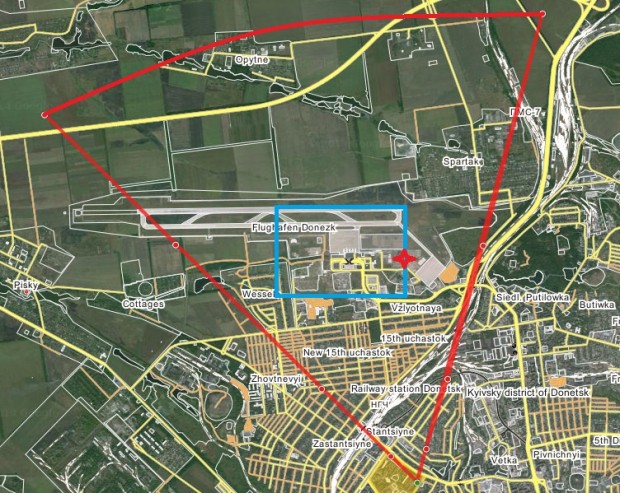 Generally speaking, most of the fighting in recent days is within the blue square, near the terminals, and off-camera to the west, near Peski. There appears to be periodic heavy machinegun fire coming from the red star, just southeast of the airport terminals — likely from positions held by the Russian-backed separatists.