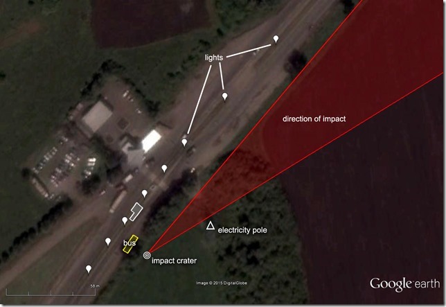 Earlier we linked to a video [here – WARNING – GRAPHIC] showing the remains of the bus hit by a shell in Volnovakha, with the bodies still inside. We also posted a screen capture of the impact crater. It is very obvious, looking at the crater, which direction the shell came from (here is a link to the 1:34 mark in the video which shows the impact crater). The videographer says ,”This is the epicenter of the explosion. It literally exploded 7 meters from the bus.”