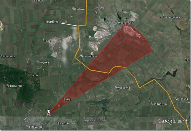 Zooming out, we see that this shell likely came from somewhere south of Donetsk: