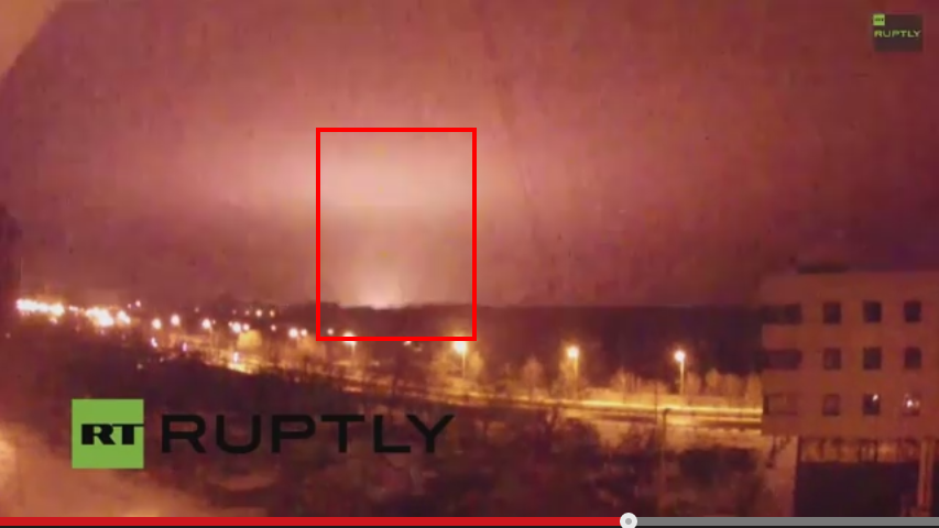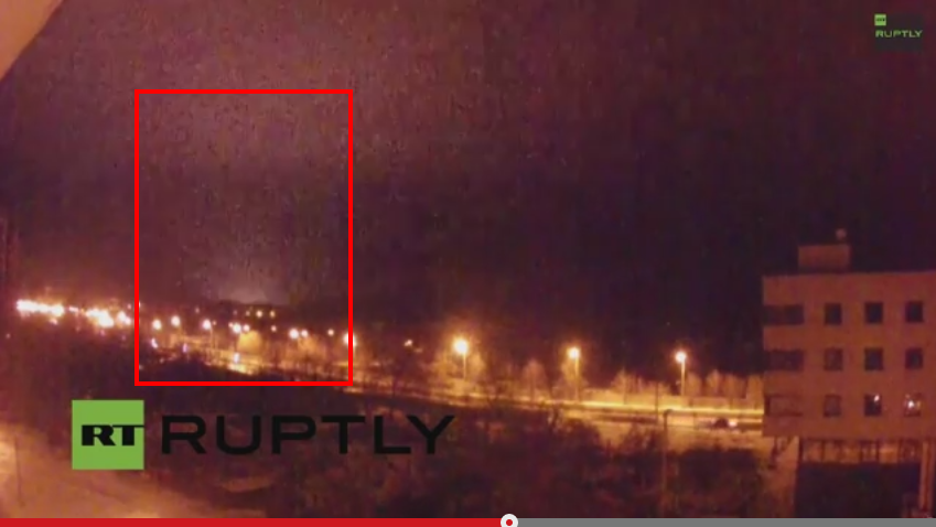 A different weapon fired the shots that hit in the center of the screen. We used a stop watch to time the gap between the light and the sound of these explosions. It took approximately 8.57 seconds for the sound to reach the camera, which means that the explosion was approximately 1.86 miles away. What this means is that those shells are much closer than the ones that hit on the right side of the screen. But it’s also possible, as we see on this map, that they may have hit a series of fuel storage tankers which are near the airport (the same ones filmed by Graham Phillips earlier today). Might that account for the fact that four of the explosions appear to be much larger than the rest? Either way, this indicates a coordinated strike between multiple artillery batteries: