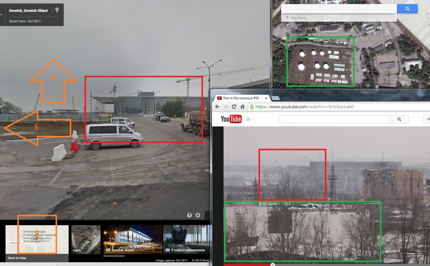 As you can see from the mashup of several maps and the video below (common structures marked by like colors), this video could only have been taken somewhere southeast of the airport, beyond the white storage tanks. This means that the shells we see hitting the airport are coming from the southwest, positions held by the Ukrainian military, or the south, which would mean that they were launched by the Russian-backed fighters. Either way, it’s not evidence of the new terminal of the airport having fallen to the anti-Ukrainian forces.