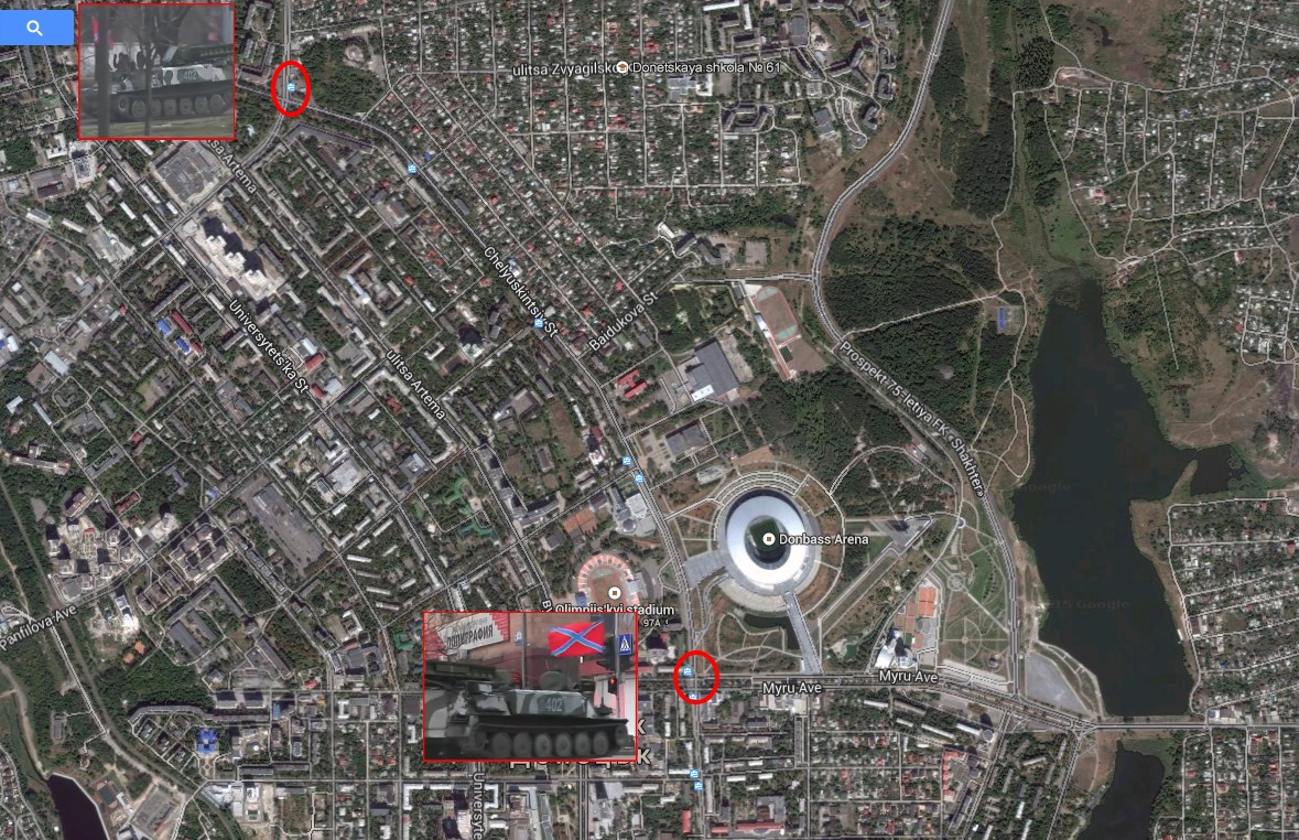 At 1:42, you can see a Strela-10 near a pink building and print shop which can be geolocated here at the corner of Chelyuskintsev and Mira Streets near the Donbass Arena and Olympic Stadium.