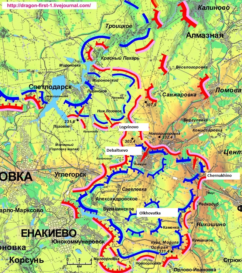 This meanwhile is a map from the pro-separatist Dragon_first_1 blog, which, while perhaps skewed, does in fact give more territory south of Debaltsevo to the Ukrainians than Shkulinov’s: