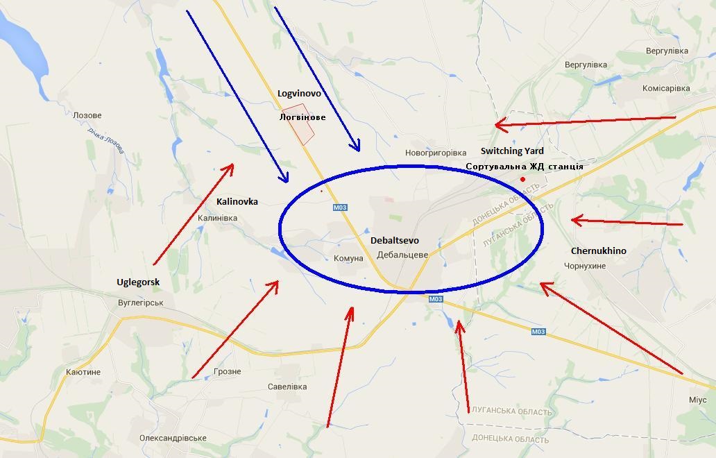 In addition, he wrote that, as of 14:00 (12:00 GMT) today, reports indicated that Russian and separatist forces had taken the switching yard on the railway line to the north-east of Debaltsevo.