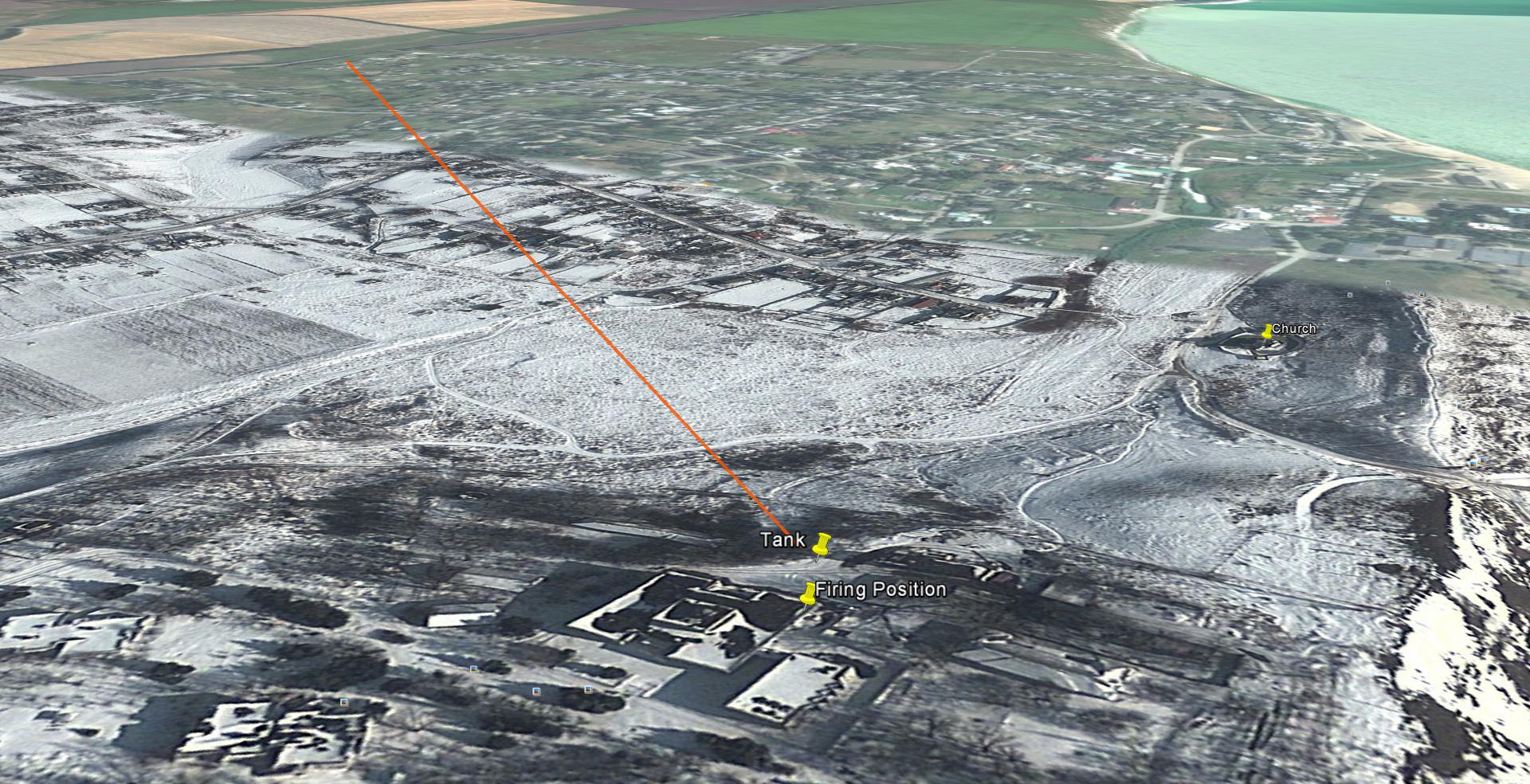 There is also a small church visible from the tanks firing position. A picture of the church found on Panoramio helps to geolocate it.