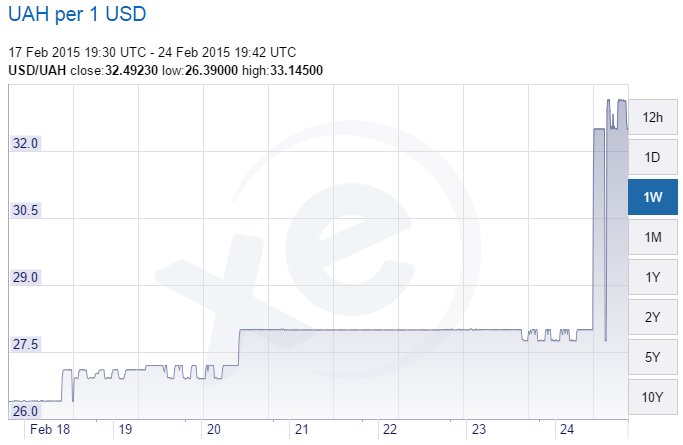 Yesterday we reported that the hryvnia fell nearly 10%, hitting record lows and triggering emergency action from Ukraine’s Central Bank. Today it has fallen another 16%, according to Bloomberg and Xe, closing at 32.50 hryvnia to a single U.S. dollar: