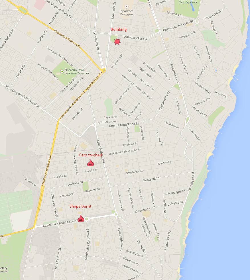 Dumskaya reported that two shops had burnt down on Academic Glushko prospect in the early hours of the morning, while two cars had been torched by unidentified arsonists. A cyclist, who attempted to intervene, was beaten.
