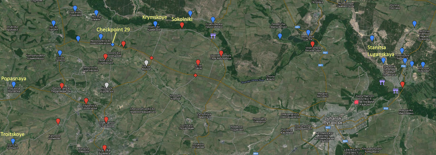 In addition, blasts from mortar and artillery shells were heard on the Bakhmutka highway near to the 29th checkpoint, and the echo from the artillery barrage could be heard as far away as Popasnaya.