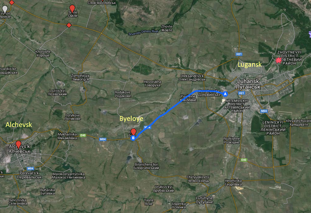 This means the tanks are headed west along the M04 highway, which runs from Lugansk to Donetsk. Many convoys from Russia have previously come through the Izvarino crossing to Lugansk, via Krasnodon, and then moved towards Donetsk along this route.