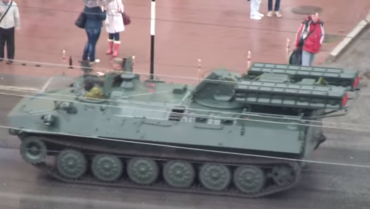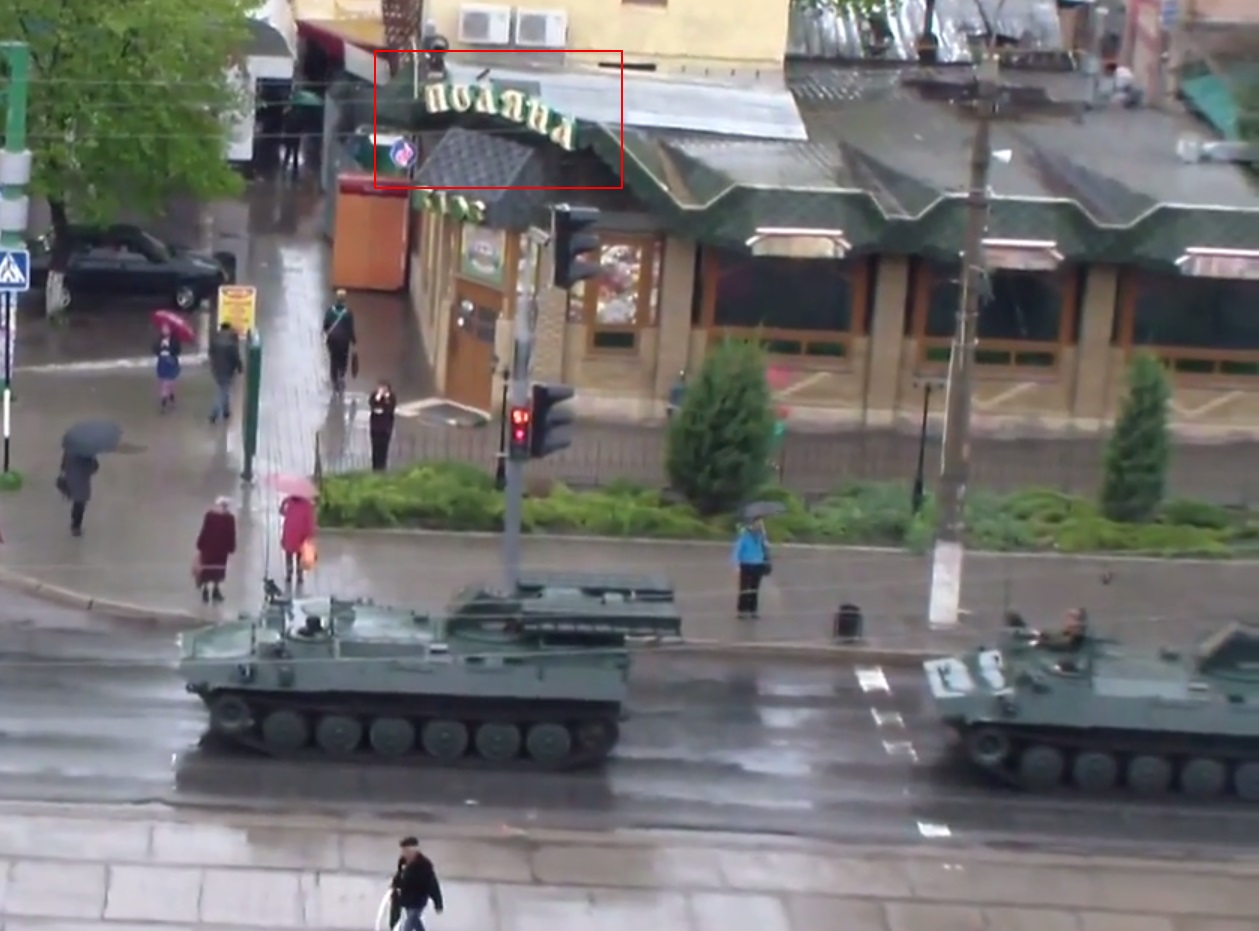 Another video, uploaded on April 30, labelled as a parade rehearsal in Lugansk, shows a similar combination of BTR-80s, Gvozdikas, Grads, towed artillery and Strela-10s: