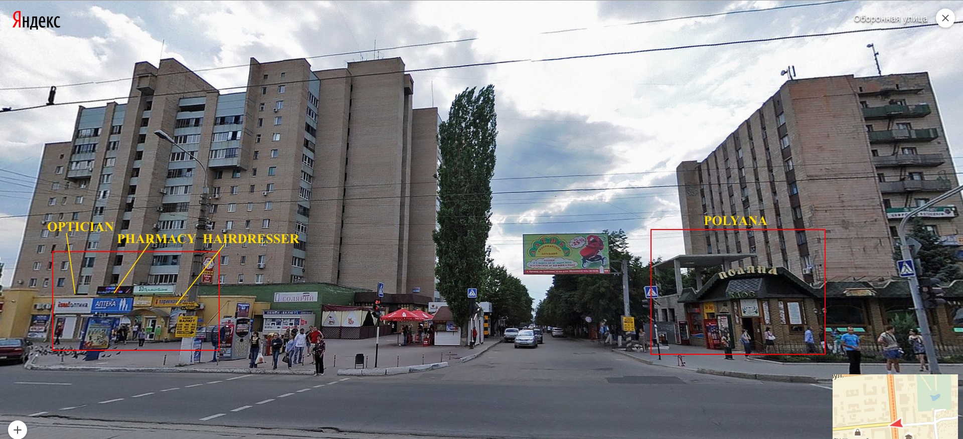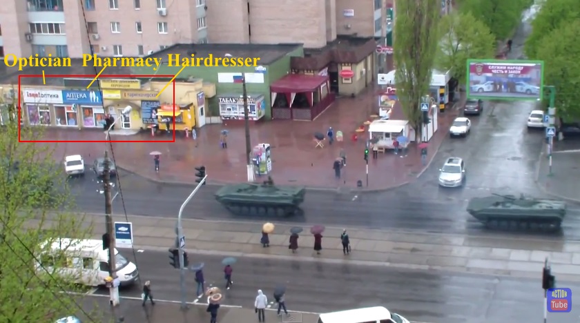 Using local directories to find the addresses for the Polyana Cafe and the Tamada hairdresser’s salon, we can geolocate the video here in Lugansk on Oboronnaya Street via Yandex Panorama.