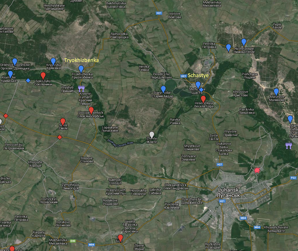 Tryokhizbenka lies on the northern banks of the Seversky Donets river, west of Schastye: