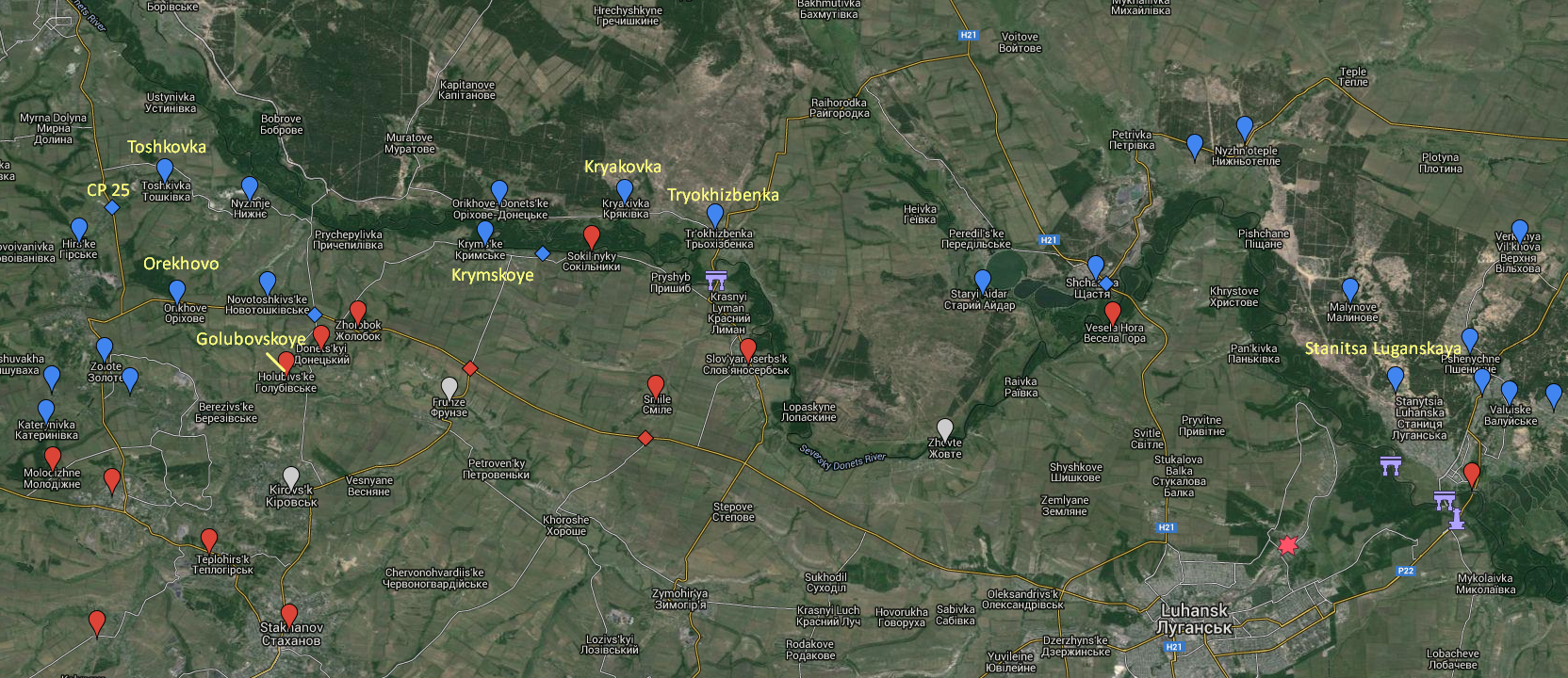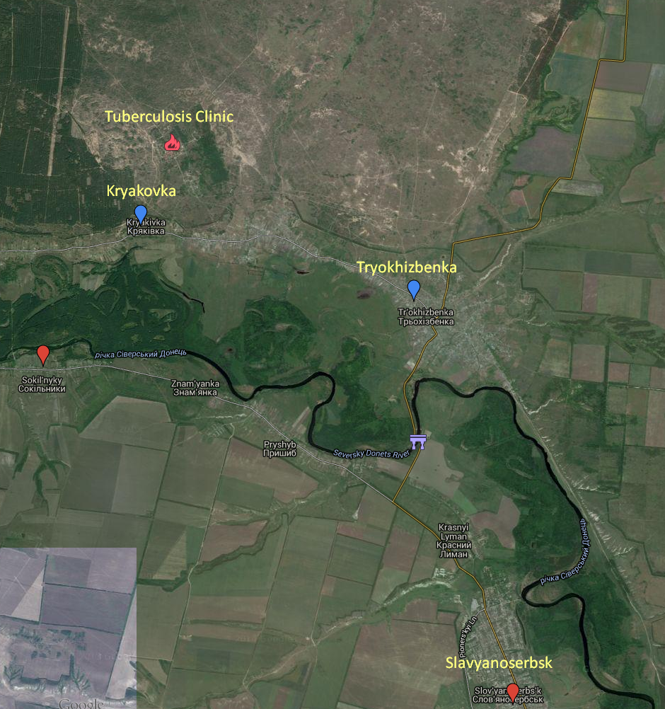 The governor of the Lugansk region, Hennadiy Moskal, has announced that two Ukrainian soldiers have been killed and two wounded outside Kryakovka, a village on the northern banks of the Seversky Donets river, just west of Tryokhizbenka.