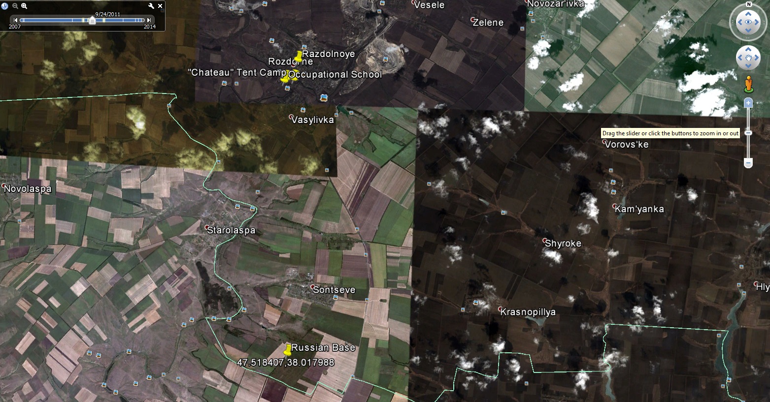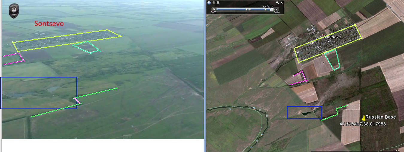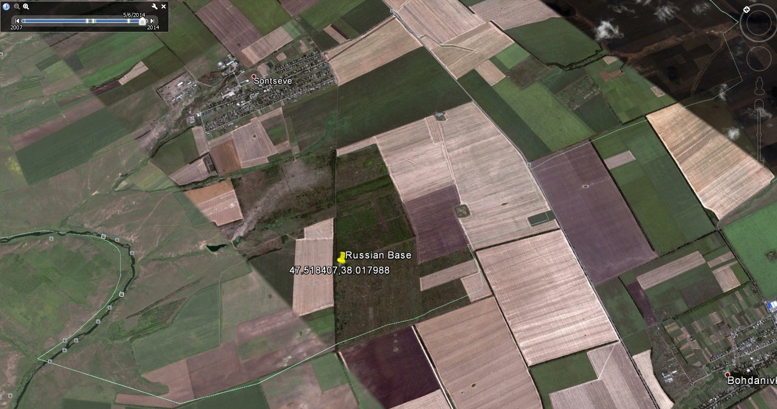 south of Sontsevo, and places the Russian base at 47.518407,38.017988
