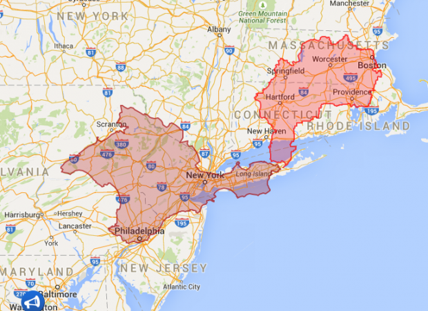 This area would cover most of Massachusetts, Rhode Island, and Connecticut, stretching from Boston to Springfield, Providence to Hartford — and beyond. But if you add Russian-occupied Crimea to the map, you can see that all of Long Island, New York City, and Philadelphia are covered, as are large parts of New Jersey and Pennsylvania, stretching nearly to Scranton in the west and Maryland in the southwest.