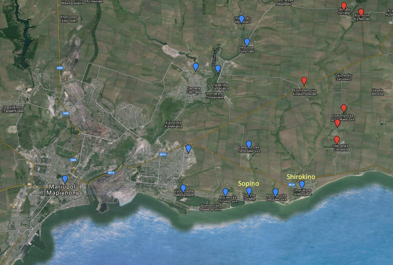 Igor Biryukov, a press officer for the Ukrainian military headquarters in Mariupol, has told the 112 television channel that the bodies of several soldiers have been found, rigged with explosive booby traps, in the village of Sopino, just east of Mariupol.