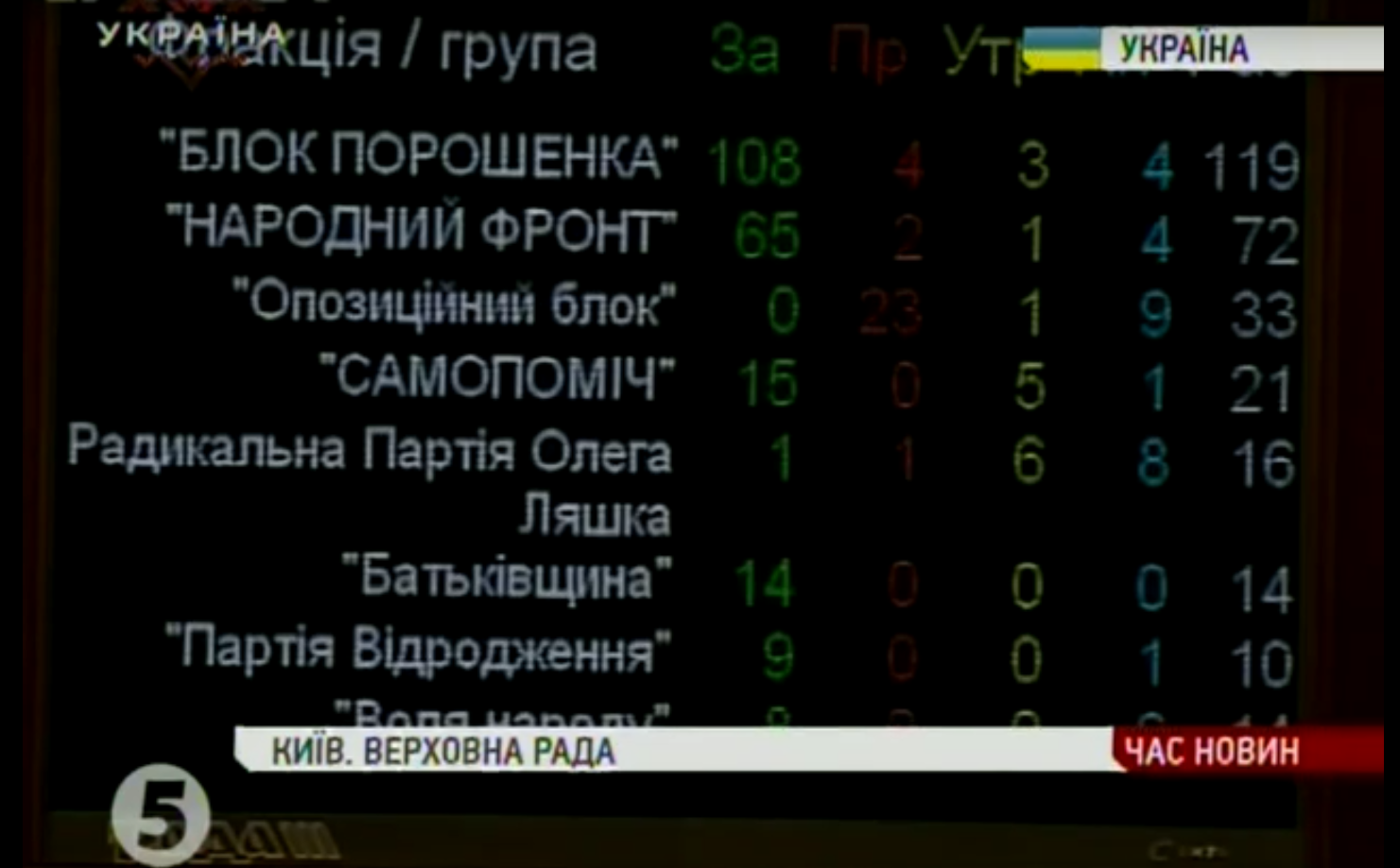 The Opposition Bloc, the party formed from the remnants of Viktor Yanukovych’s Party of Regions, from which not a single MP voted in favour of the bill. Indeed, two Opposition Bloc MPs appear to have switched their votes from abstention to against between the two rounds today.