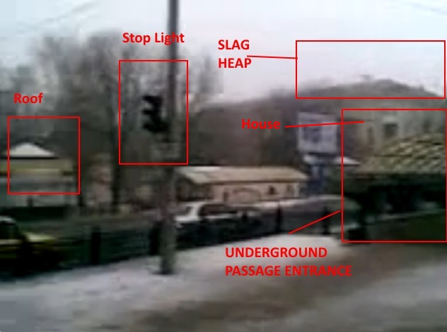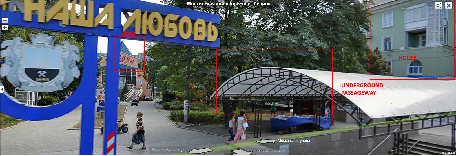 The curved roof to the underground passage, the stop light, the roof, and the house can be seen in Yandex street view.
