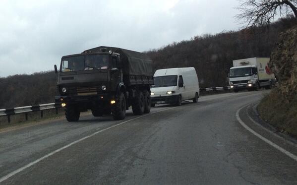Just passed ten Russian military trucks full of men They were on the road heading from Sevastopol towards Simferopol.